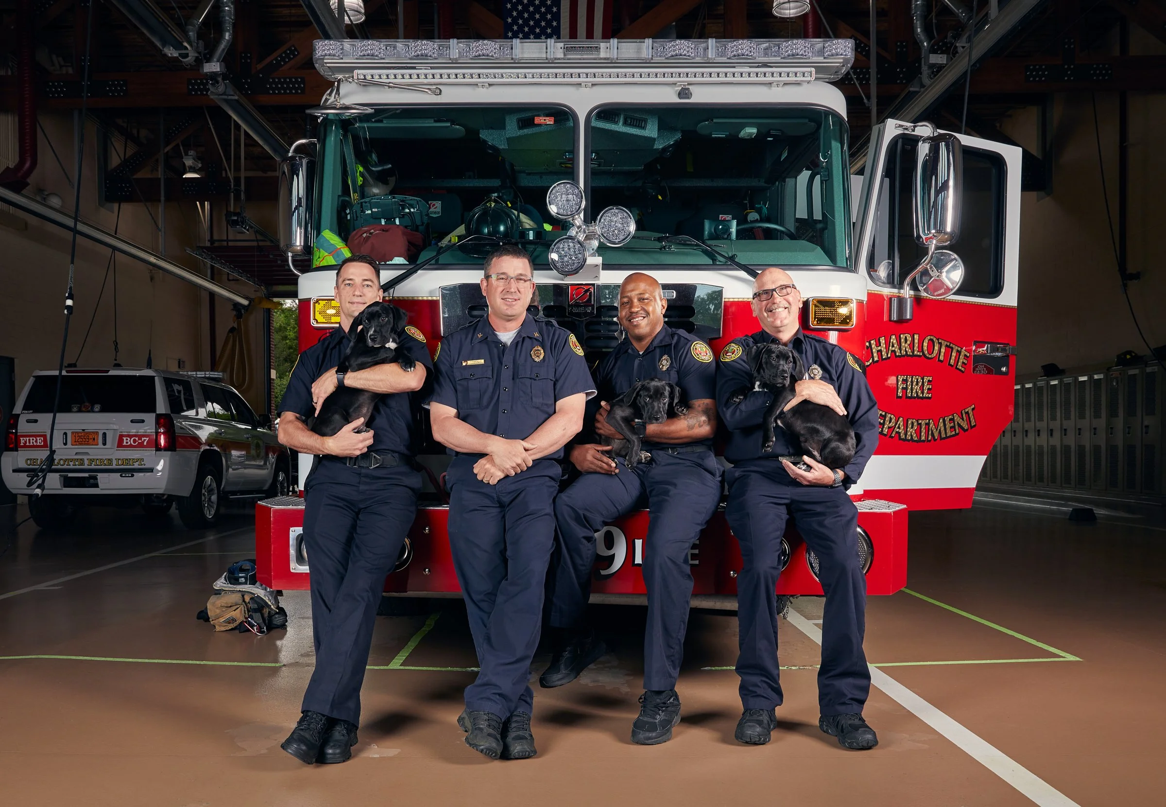 Al’s Pups and Pals teamed up with local foster groups and a few of Charlotte’s first responders at Station 39 to showcase adoptable pups in our community. This shoot was a wild success as all featured dogs were adopted within a few weeks. We also had the support of local news station Charlotte WCNC who aired a story about this heartwarming photo shoot. A huge thank you to Charlotte Fire and Adopt Me CLT for making this idea come to life.